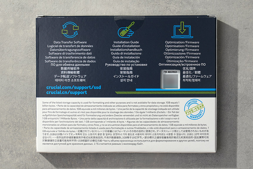 박스의 뒷면을 살펴보면 데이터 이전 소프트웨어나 최적화 펌웨어 등을 제공합니다. 그리고 주목해야할 부분은 5년 동안의 AS를 제공한다는 점입니다. 그런데 저도 오랜시간 SSD를 사용했지만 고장이 나는 경우는 거의 없었습니다.