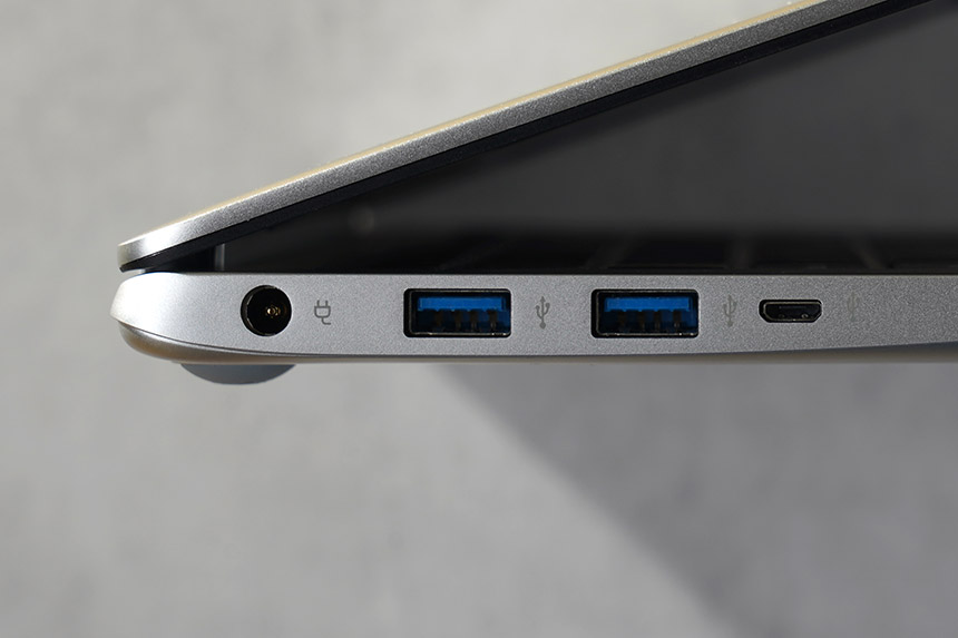 LG전자 울트라PC 13UD50N-GX50K의 입출력 단자를 살펴보면 왼쪽에는 전원 단자와 2개의 USB 3.1 포트가 배치되어 있습니다. 그리고 맨 오른쪽의 마이크로 5핀 USB단자에는 유선랜 젠더를 연결해서 유선 인터넷을 사용할 수도 있습니다.