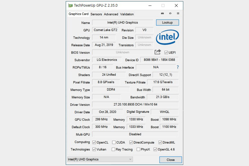 CPU에는 인텔 UHD 그래픽 내장 그래픽카드가 포함되어 있습니다. 4K 60Hz를 지원하기 때문에 동영상 감상은 물론이고 간단한 캐주얼 게임 정도는 플레이할 수 있는 성능을 제공합니다.