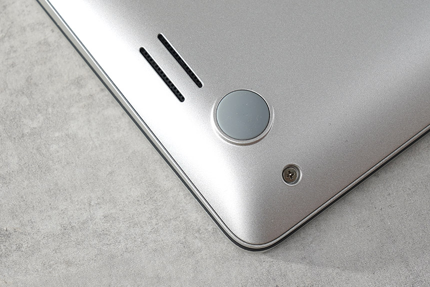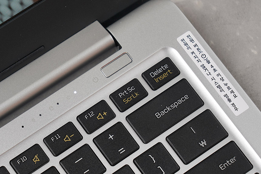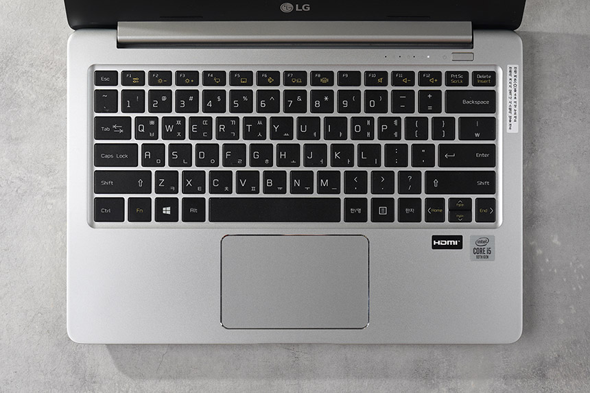키보드를 자세하게 살펴보면 전원 버튼은 분리되어 있어서 실수로 누를 일은 적어 보입니다. 그리고 옆쪽에는 LG전자 울트라PC 13UD50N-GX50K의 각종 상태를 보여주는 4개의 LED가 배치되어 있습니다.