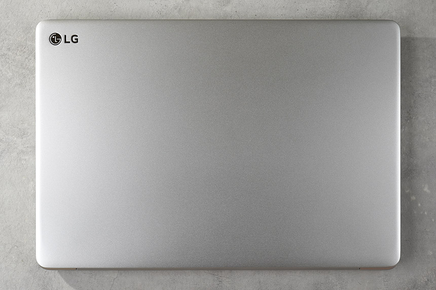 상판의 모서리 부분에는 심플한 디자인에 포인트가 되는 LG전자의 로고가 각인되어 있습니다. 전체적으로 모나지 않은 디자인을 채택했다는 점이 LG전자 울트라PC 13UD50N-GX50K의 장점 중의 하나입니다.