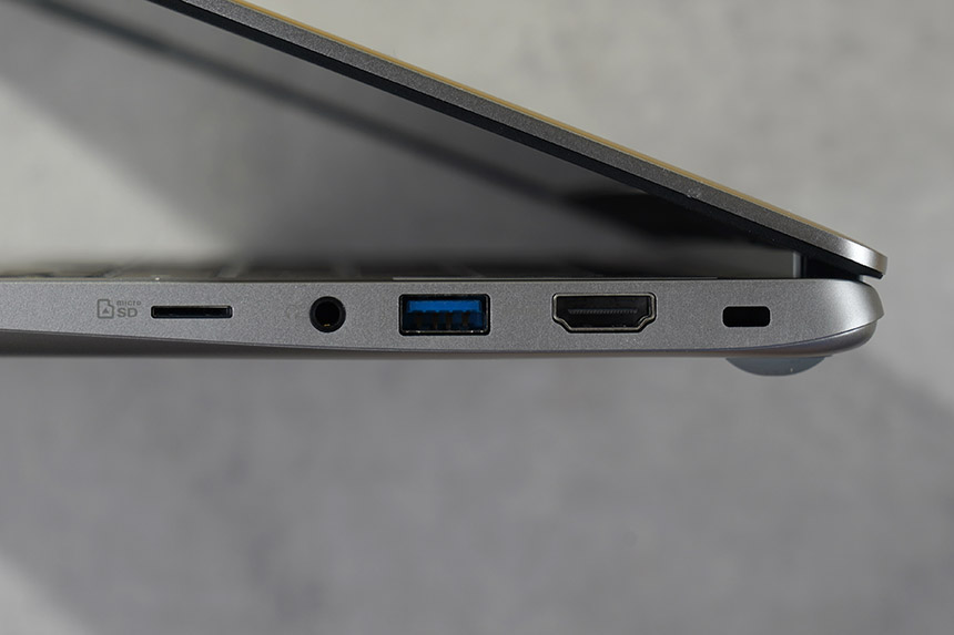 반대쪽 옆면에는 마이크로SD 카드 슬롯과 헤드폰 출력 그리고 USB 3.1과 HDMI 포트가 준비되어 있습니다. 확장성은 무난한 편이지만 USB C타입 커넥터가 없다는 점은 조금 아쉬운 부분입니다.