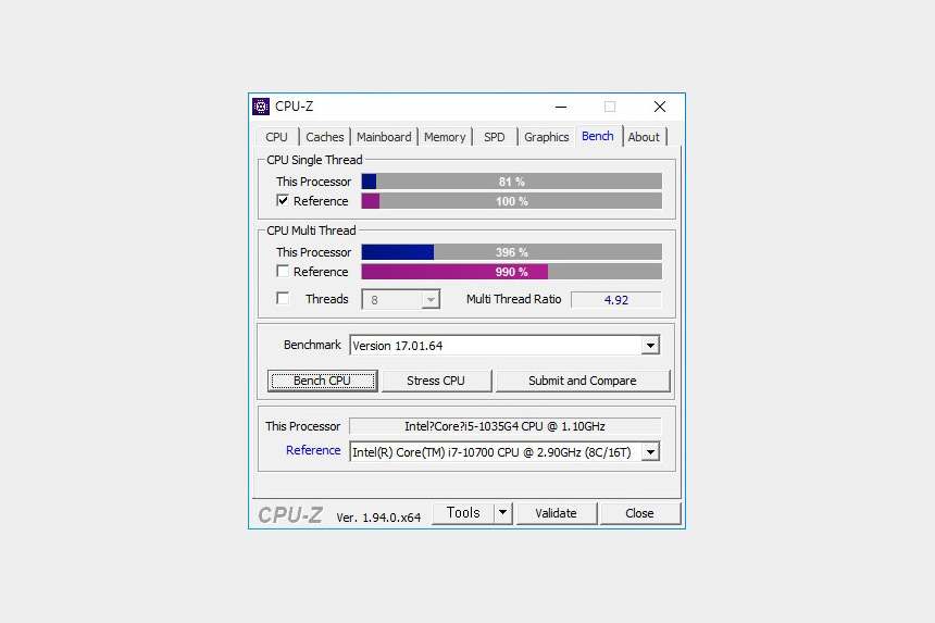 10세대 인텔 코어 i5-1035G4 프로세서의 성능을 살펴보면 싱글 스레드는 데스크톱 프로세서 10세대 인텔 코어 i7-10700의 약 81% 정도로 준수한 모습을 보여주었습니다.