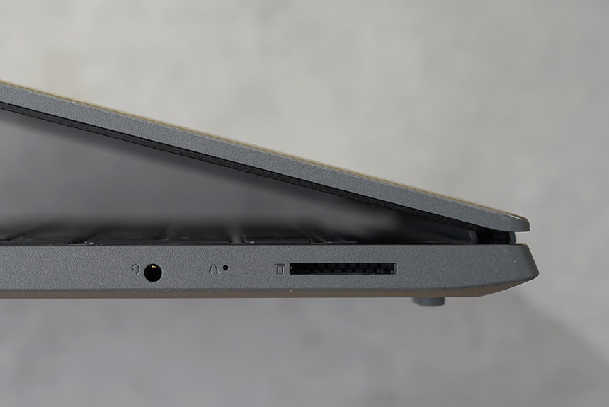 반대쪽 옆면에는 오디오 잭과 SD카드 리더기가 탑재되었습니다. 그래서 디지털카메라나 블랙박스 등 메모리 카드를 사용하는 장치들의 데이터를 빠르게 옮길 수 있습니다. 확장성은 준수하지만 최근에 많이 채택되는 USB C타입 단자가 없다는 점은 아쉬운 부분입니다.