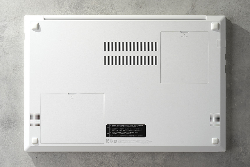 하판의 모서리 부분에는 고무 지지대가 배치되어 있어서 책상 위에서 잘 미끄러지지 않는 편입니다. 그리고 메모리와 저장공간을 확장할 수 있는 도어가 부착되어 있습니다. 뒷판 전체를 분리하지 않고 업그레이드 할 수 있다는 장점이 있습니다.