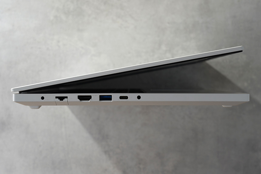 입출력 단자를 살펴보면 왼쪽에는 직장인들에게 유용한 유선랜과 HDMI 그리고 USB 3.0, USB C타입, 헤드폰 출력/마이크 입력 콤보 단자가 배치되어 있습니다.