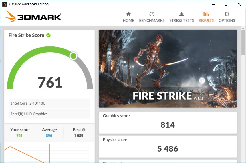 3DMARK를 통해서 인텔 UHD 그래픽 내장 그래픽카드의 성능을 확인해 보면 Fire Strike의 점수는 761점이 측정되었습니다. 높은 수준이라고 이야기하기는 어려울 것 같습니다.