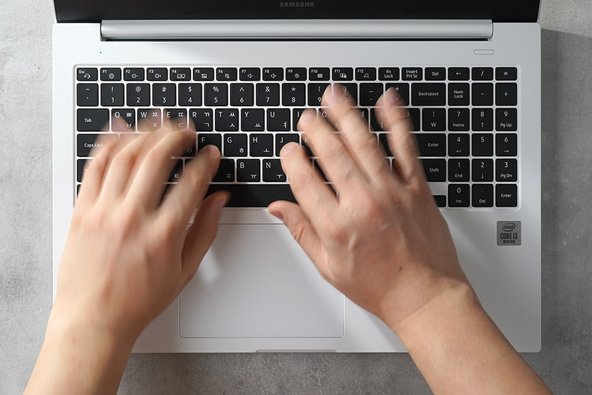 키보드의 키캡은 기존의 자사 제품(NT880EBE) 대비 약 10% 더 커졌습니다. 그래서 상대적으로 오타가 적게 나는 편입니다. 장시간 문서 작업을 많이 하는 분들에게 유용한 부분입니다.