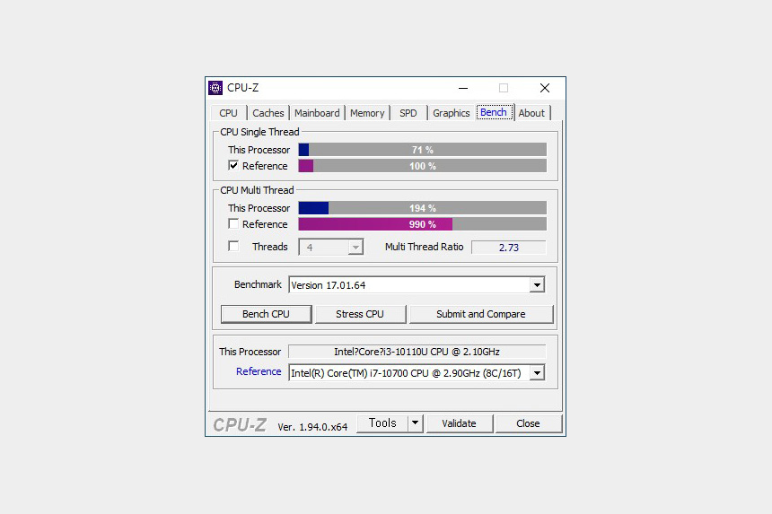 10세대 인텔 코어 i3-10110U 프로세서의 싱글 스레드 성능은 10세대 인텔 코어 i7-10700의 약 71% 정도로 보급형 CPU 정도의 성능을 보여주었습니다.