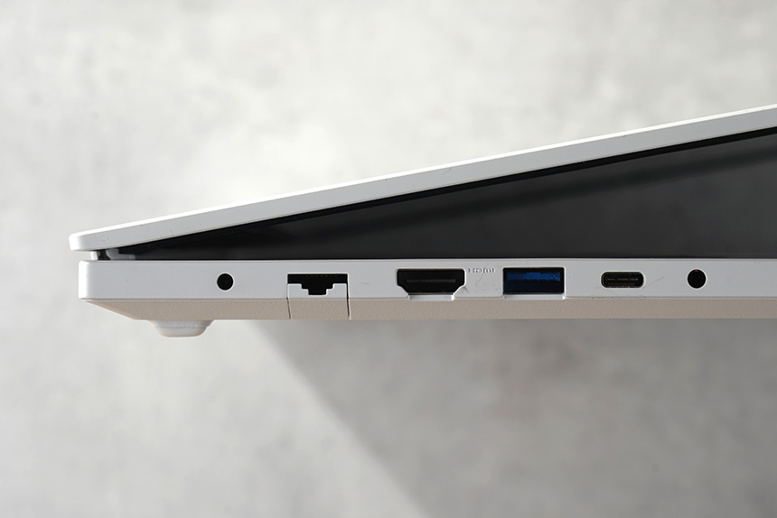 입출력 단자를 살펴보면 왼쪽에는 직장인들에게 유용한 유선랜과 HDMI 그리고 USB 3.0, USB C타입, 헤드폰 출력/마이크 입력 콤보 단자가 배치되어 있습니다.