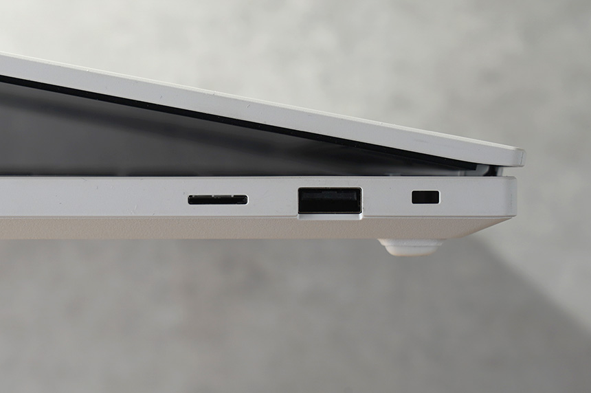 반대쪽 옆면에는 마이크로SD 카드 리더기와 USB 2.0 포트 그리고 시큐리티 슬롯이 배치되어 있습니다. 확장성은 크게 부족한 부분은 없은 수준이라고 판단되었습니다.
