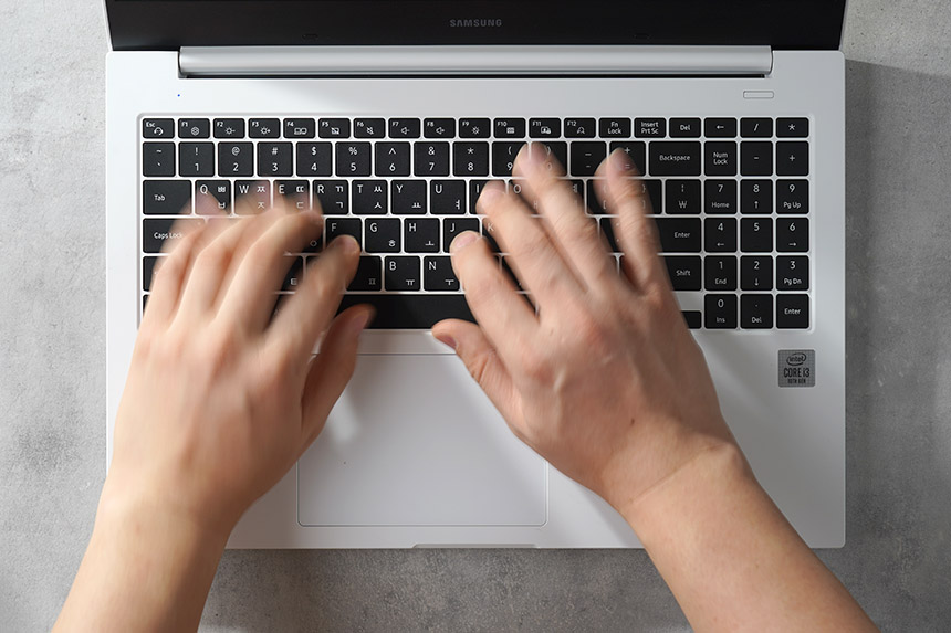 키보드의 키캡은 기존의 자사 제품(NT880EBE) 대비 약 10% 더 커졌습니다. 그래서 상대적으로 오타가 적게 나는 편입니다. 장시간 문서 작업을 많이 하는 분들에게 유용한 부분입니다.