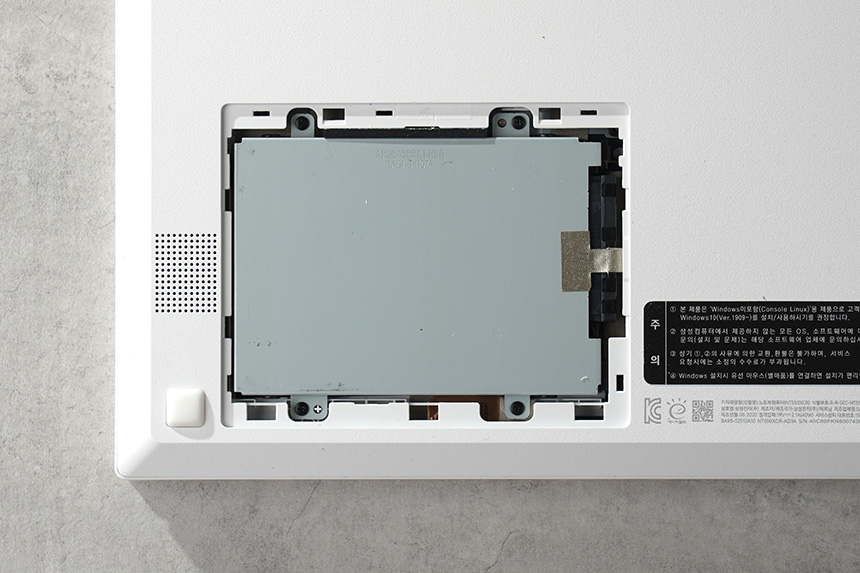 하판의 모서리 부분에는 고무 지지대가 배치되어 있어서 책상 위에서 잘 미끄러지지 않는 편입니다. 그리고 메모리와 저장공간을 확장할 수 있는 도어가 부착되어 있습니다. 뒷판 전체를 분리하지 않고 업그레이드 할 수 있다는 장점이 있습니다.