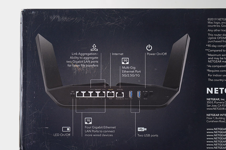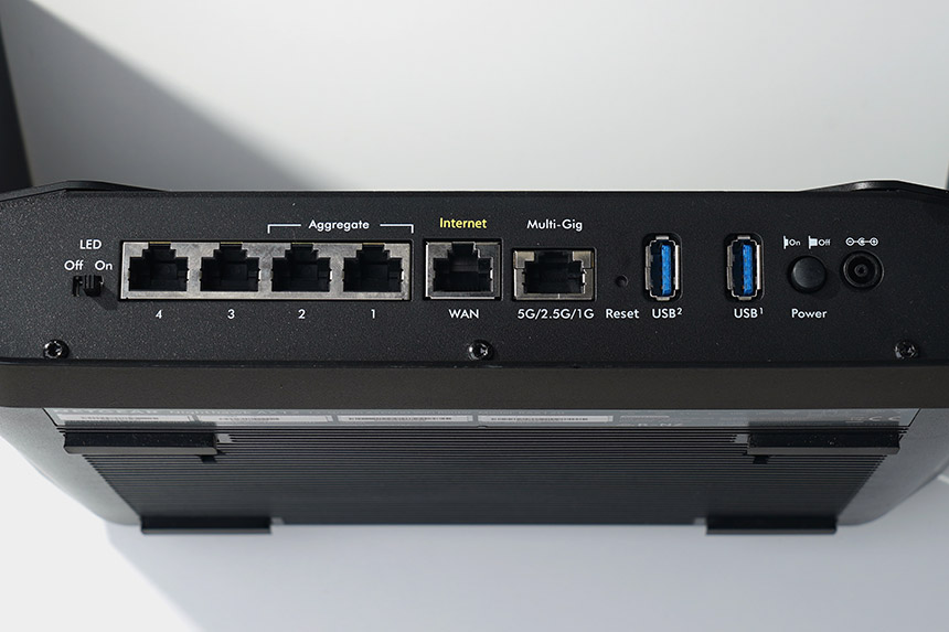 넷기어 RAX120 와이파이6 공유기의 구조를 확인해 보면 LED를 ON/OFF 할 수 있는 별도의 버튼이 배치되어 있습니다. 그 외에도 Multi-Gig 포트를 탑재하고 있다는 점이 독특한 부분입니다.