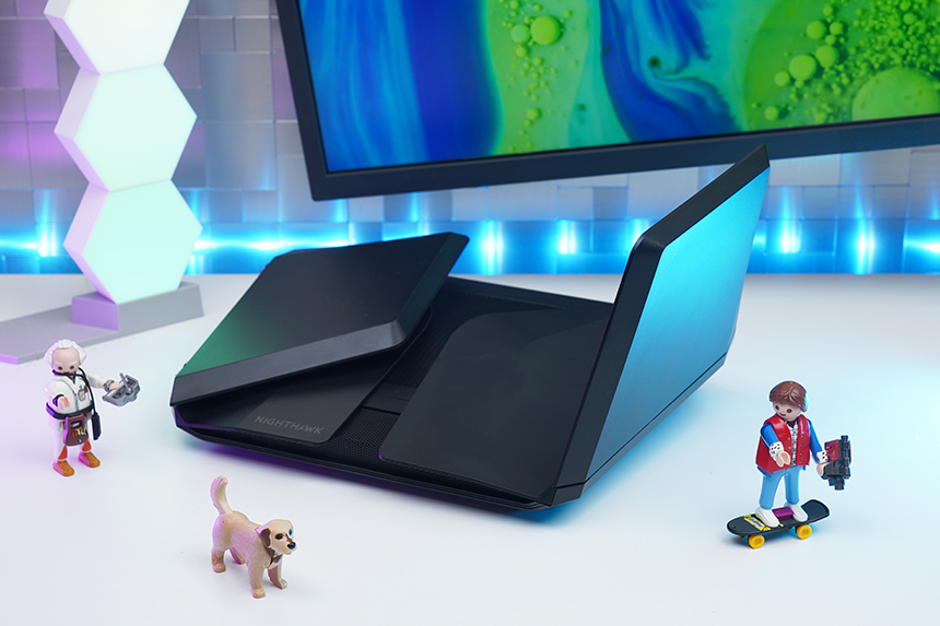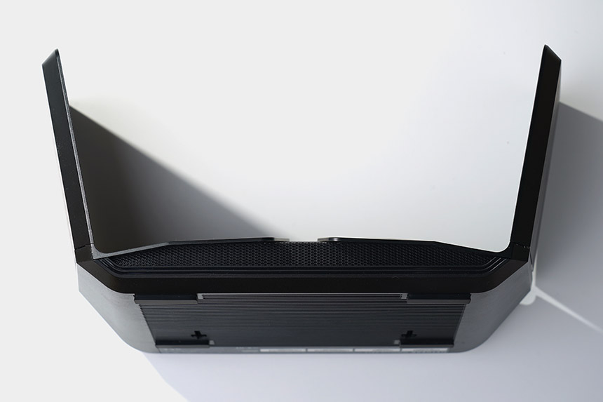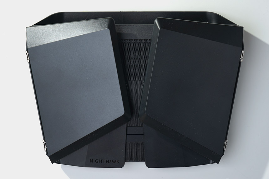 넷기어 RAX120 와이파이6 공유기는 흡사 우주선을 닮은 디자인을 채택했습니다. 넷기어의 나이트호크 라인업에 소속된 제품들의 특징이라고 할 수 있습니다. 그리고 날개는 사용하지 않을 때 접어놓을 수 있도록 제작되었습니다.