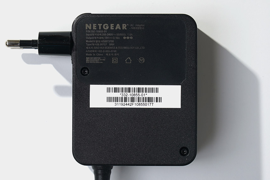 넷기어 RAX120 와이파이6 공유기의 어댑터는 무난한 크기로 제작되었고 출력은 19V, 3.16A로 일반적인 유무선 공유기와 비교하면 고성능 제품이라서 조금 높은 편이라고 할 수 있습니다.