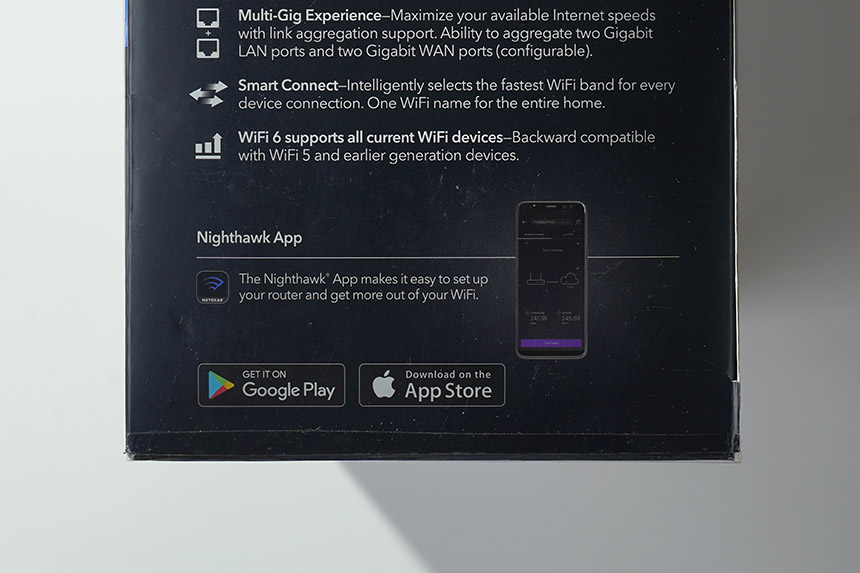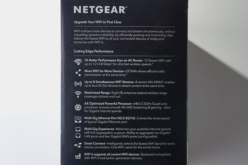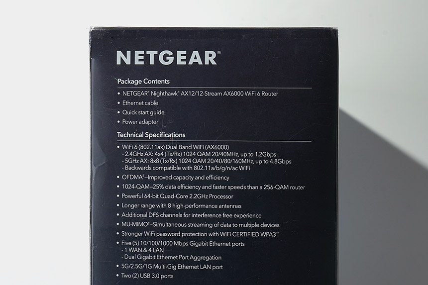 넷기어 RAX120 와이파이6 공유기의 박스는 세련된 형태로 제작되었습니다. 상단을 살펴보면 최신 규격의 WiFi6를 지원하는 제품이라는 문구가 표시되어 있습니다. 참고로 통합 속도는 6,000Mbps를 지원합니다.