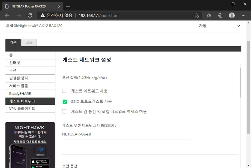 게스트 네트워크를 활성화하면 내부망과 분리된 별도의 네트워크를 만들어 줄 수 있습니다. 사무실이나 카페 등에서 넷기어 RAX120 와이파이6 공유기를 활용하기를 원하는 분들에게 적합한 기능입니다.