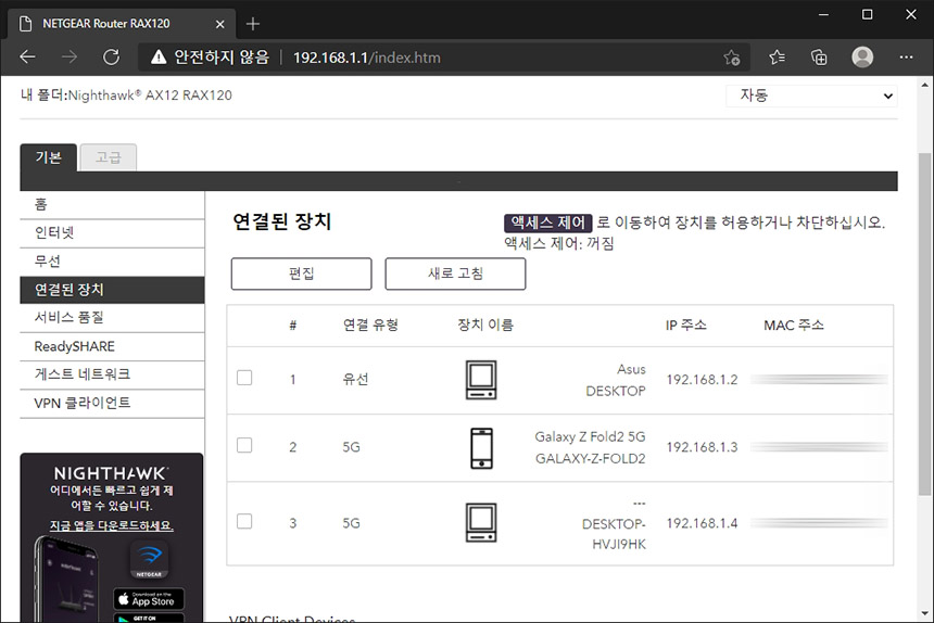 연결된 장치 메뉴를 살펴보면 현재 넷기어 RAX120 와이파이6 공유기에 접속해있는 장치들을 유형과 이름을 확인할 수 있습니다. 그리고 액세스 제어 기능과 연동해서 장치를 차단하거나 허용할 수 있습니다.