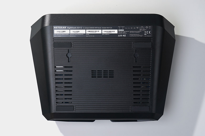 넷기어 RAX120 와이파이6 공유기의 바닥을 살펴보면 모서리 부분에 고무 지지대가 배치되어 있어서 설치 장소에서 잘 미끄러지지 않는 편입니다. 그리고 벽에 걸어서 고정할 수 있는 고리도 준비되어 있습니다.