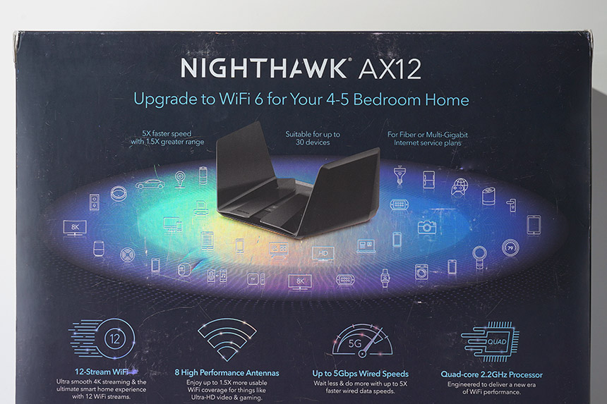 박스의 뒤쪽에는 넷기어 RAX120 와이파이6 공유기의 주요 특징이 설명되어 있습니다. 우선 12스트림 와이파이를 지원하고 8개의 안테나가 좌우 날개에 장착되어 있습니다. 그리고 속도 빠른 2.2GHz 쿼드 코어 프로세서가 탑재되었습니다.