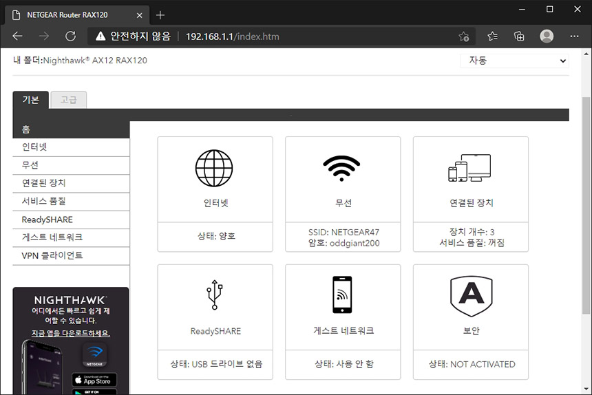 넷기어 RAX120 와이파이6 공유기의 관리자 페이지는 http://www.routerlogin.net 라는 주소나 http://192.168.1.1 이라는 주소로 접속할 수 있습니다. 그리고 홈 메뉴에서는 현재 상태를 바로 확인할 수 있습니다.