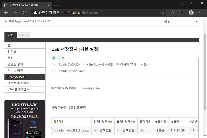 ReadySHARE 메뉴에서는 넷기어 RAX120 와이파이6 공유기에 연결된 외장하드를 NAS로 활용할 수 있는 기능을 제공합니다. 특히 고급 메뉴에서는 네트워크 환경이나 HTTP 그리고 FTP와 같은 접속 방법을 제공합니다.