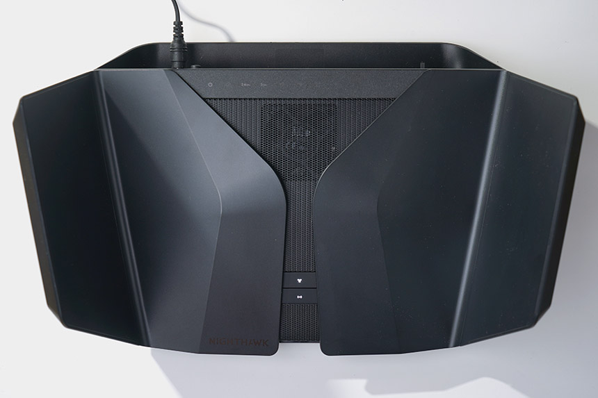 넷기어 RAX120 와이파이6 공유기는 흡사 우주선을 닮은 디자인을 채택했습니다. 넷기어의 나이트호크 라인업에 소속된 제품들의 특징이라고 할 수 있습니다. 그리고 날개는 사용하지 않을 때 접어놓을 수 있도록 제작되었습니다.