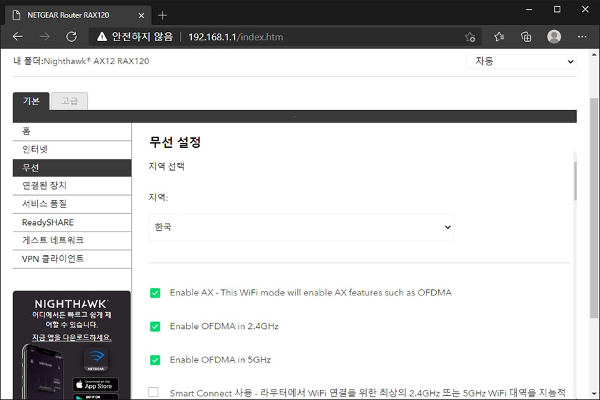 무선 메뉴에서는 지역 선택이나 2.4GHz와 5GHz 주파수 대역의 채널을 선택할 수 있는 기능이 준비되어 있습니다. 참고로 속도가 제대로 나오지 않는다고 생각되신다면 5GHz 대역의 채널을 조절해 보시길 바랍니다.