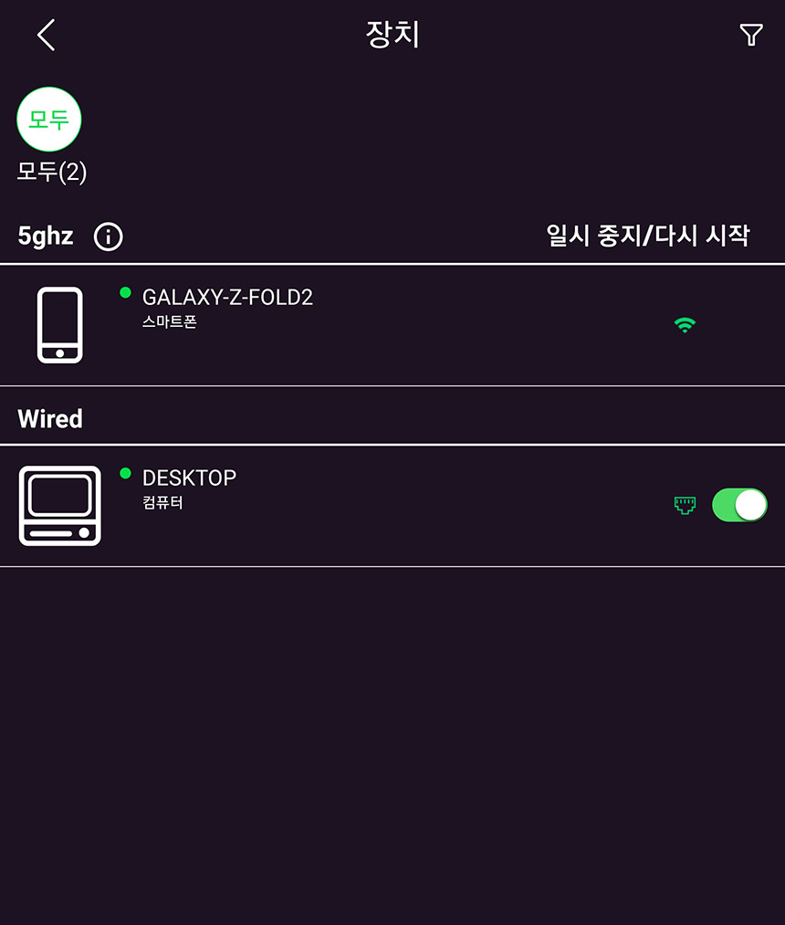 장치 관리자를 확인해 보면 현재 넷기어 RAX120 와이파이6 공유기에 접속해있는 장치들의 리스트를 확인할 수 있습니다. 특히 유무선 정보까지 표시되고 일시 중지나 다시 시작과 같은 기능도 지원합니다.
