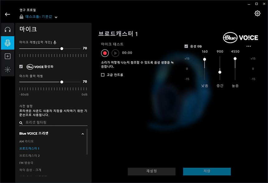 마이크에는 BLUE VO!CE 필터를 적용할 수 있습니다. 특히 주목할 부분은 다양한 프리셋들이 준비되어 있어서 상황에 맞게 음성을 변환할 수 있다는 점입니다. 참고로 마이크로 유명한 블루 마이크로폰은 2018년 로지텍에 인수되었고 관련 기술들이 서로 공유되고 있습니다.