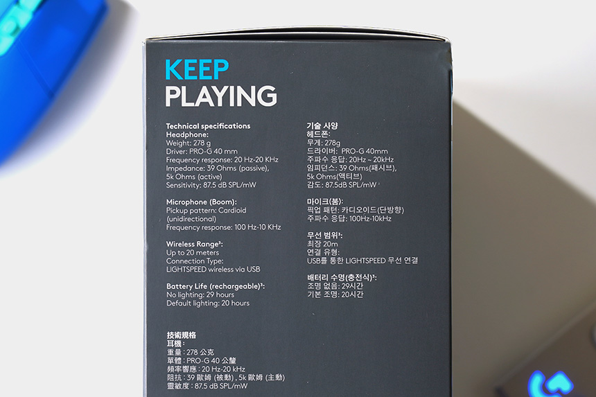 스펙을 살펴보면 무게는 278g으로 무선 게이밍 헤드셋 중에서는 상당히 가벼운 편입니다. 그리고 로지텍 PRO-G 40mm 드라이버가 탑재되었고 카디오이드 픽업 패턴 마이크가 탑재되었습니다. 그 외에도 LIGHTSPEED 무선 기술이 탑재되어서 최대 20미터 거리에서 자유롭게 사용할 수 있습니다.
