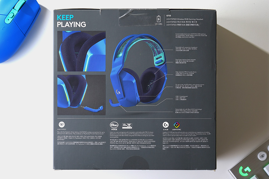 박스의 뒷면에는 로지텍 G733 무선 게이밍 헤드셋의 주요 특징들이 설명되어 있습니다. 기대되는 부분은 최대 29시간 정도 사용할 수 있는 배터리가 탑재되었다는 점입니다. 그리고 무게도 가볍고 착용감도 좋아서 장시간 편안하게 게임을 플레이할 수 있습니다.