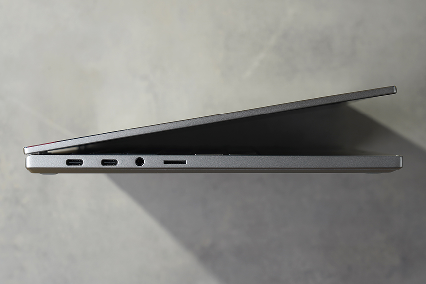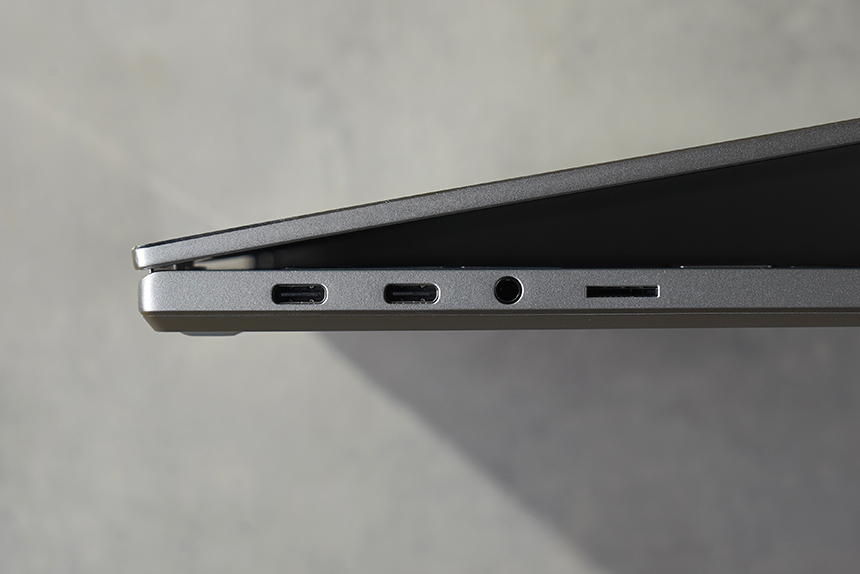 입출력 단자를 살펴보면 USB 타입C 포트와 썬더볼트4 단자 그리고 헤드폰 출력/마이크 입력 콤보와 UFS, 마이크로SD카드 겸용 슬롯이 배치되어 있습니다. 썬더볼트4의 활용도가 높을 것으로 예상합니다.