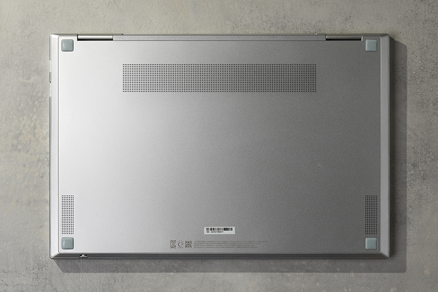 바닥을 살펴보면 모서리 부분에 지지대가 배치되어 있어서 갤럭시북 플렉스2 5G가 바로 바닥에 닿는 것을 방지해주는 역할을 합니다. 그리고 바디 자체는 알루미늄으로 제작되어서 스크래치나 얼룩에 강하다는 장점이 있습니다.