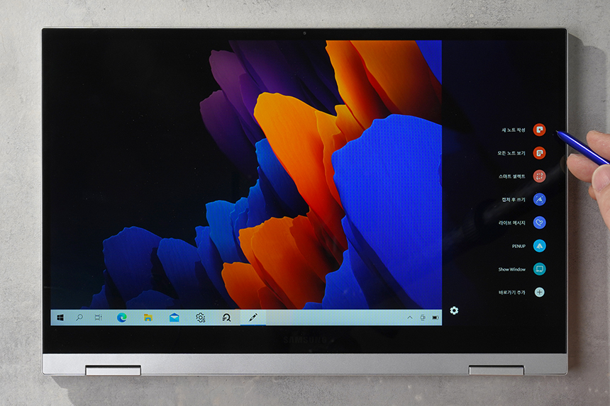 갤럭시북 플렉스2 5G는 S펜을 분리하거나 화면 가까이서 버튼을 누르면 에어 커맨드 기능이 실행됩니다. 그래서 간단하게 새 노트를 작성하거나 캡쳐 후 쓰기와 같은 기능을 실행시킬 수 있습니다.