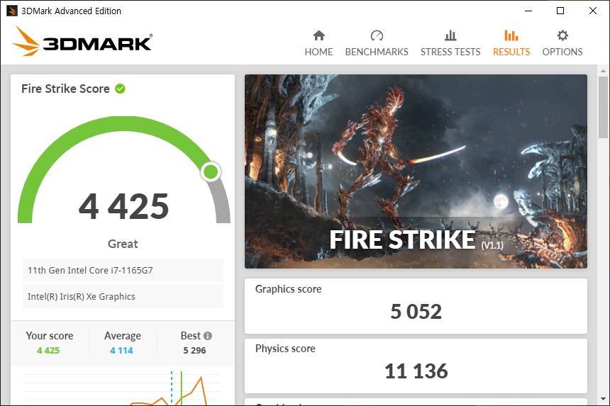 3DMARK를 통해서 인텔 아이리스 Xe 내장 그래픽카드의 성능을 확인해 보면 FIRE STRIKE 점수는 4425점이 측정되었습니다. 실제 리그 오브 레전드 프레임은 잠시 후에 확인해 보도록 하겠습니다.