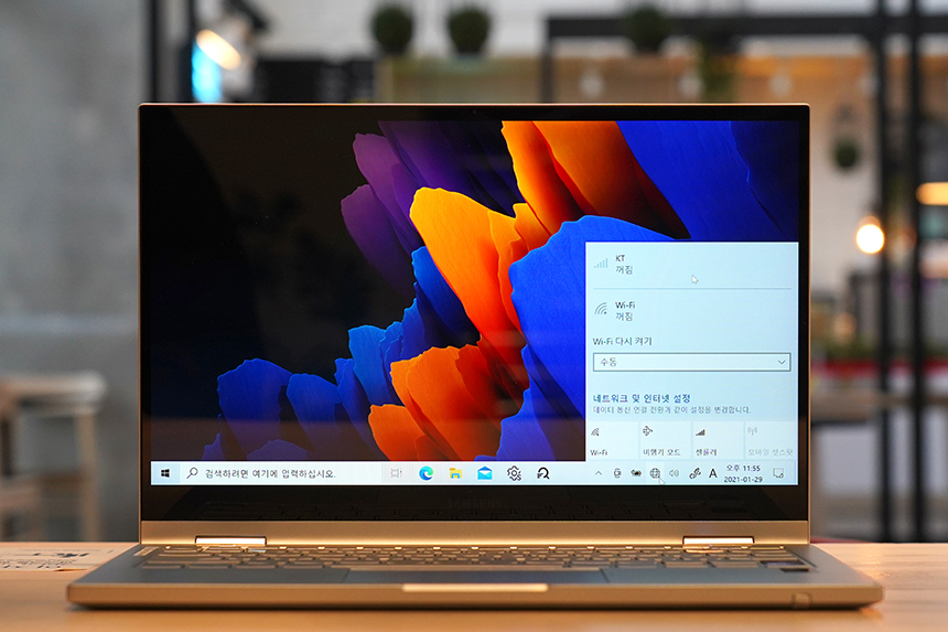 갤럭시북 플렉스2 5G에는 이름에서도 알 수 있듯이 5G 네트워크에 접속할 수 있는 기능을 갖추고 있습니다. 그래서 와이파이를 사용할 수 없는 야외에서도 활용도가 높은 편입니다.