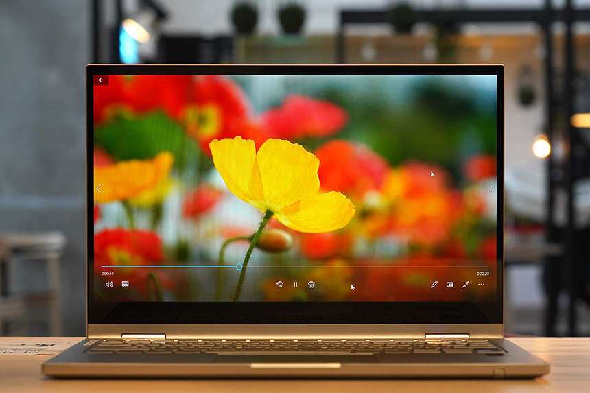 갤럭시북 플렉스2 5G에는 13.3인치 QLED 디스플레이가 탑재되어서 동영상 감상 용도로도 부족하지 않은 화면을 제공합니다. 특히 최대 600니트의 밝기를 제공한다는 점이 유용한 부분입니다.