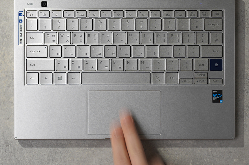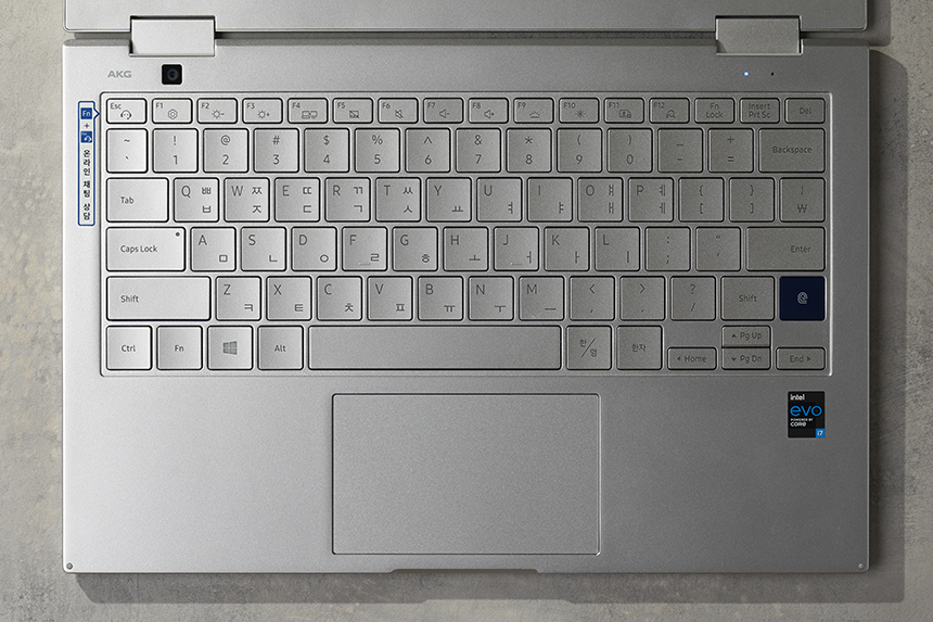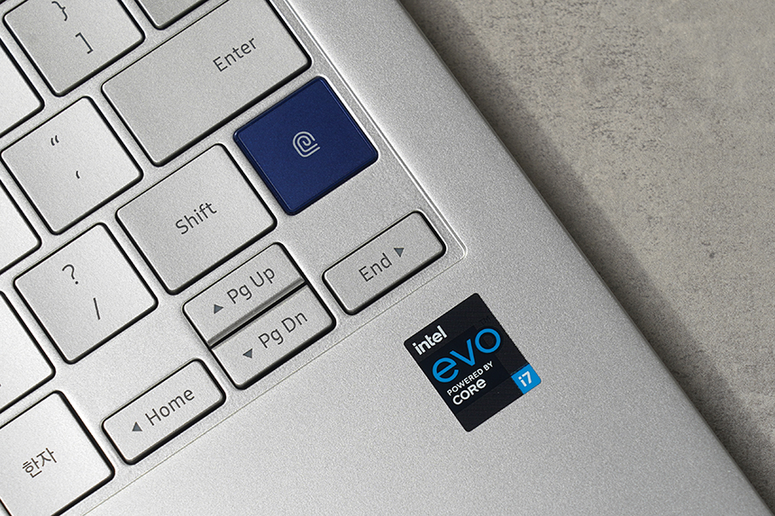 키보드의 오른쪽에는 지문인식 센서가 탑재되어 있어서 간단하게 잠금을 해제할 수 있습니다. 그리고 아래쪽에는 인텔 EVO 플랫폼 인증을 받은 제품이라는 내용이 설명되어 있습니다.