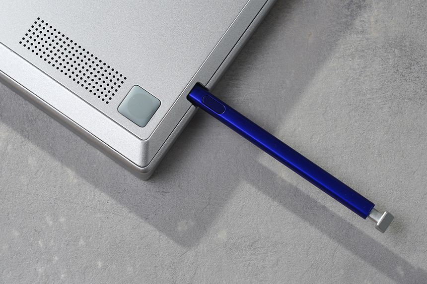 갤럭시북 플렉스2 5G의 아래쪽에는 파란색 S펜이 수납되어 있습니다. 참고로 디지털 펜이 내부로 수납되지 않는 제품들은 상대적으로 분실의 우려가 큰 편입니다.