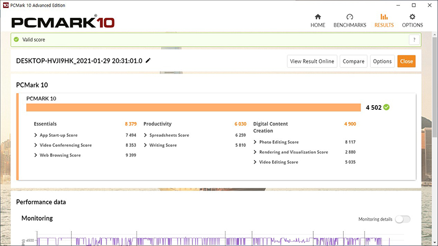 노트북의 전반적인 성능을 평가해주는 PCMAKR10의 점수는 4502점이 측정되었습니다. 갤럭시북 플렉스2 5G의 전체적인 성능은 준수한 수준이라고 판단되었습니다.