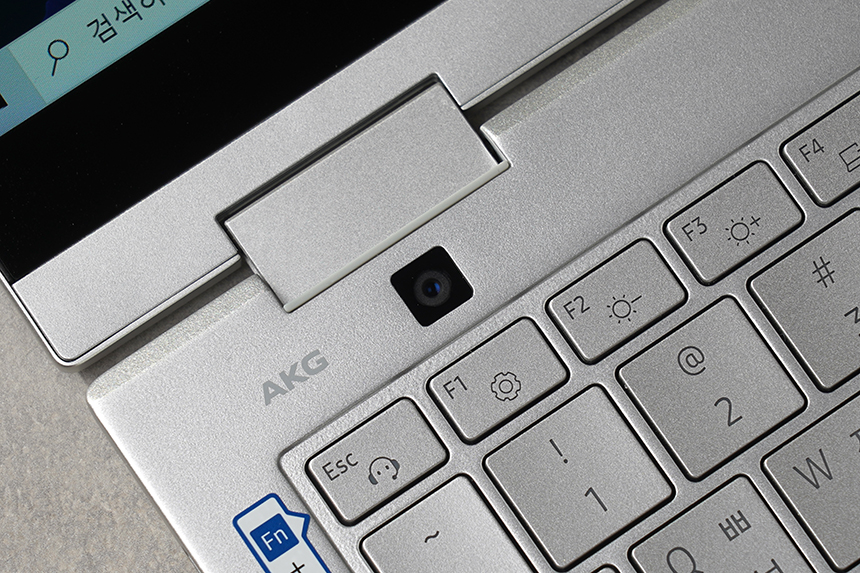 키보드의 위쪽에는 1,300만 화소의 카메라가 탑재되었습니다. 간단하게 사진이나 동영상을 촬영해서 다른 사람들과 공유할 수 있다는 장점이 있습니다. 갤럭시북 플렉스2 5G의 차별화된 요소 중의 하나입니다.