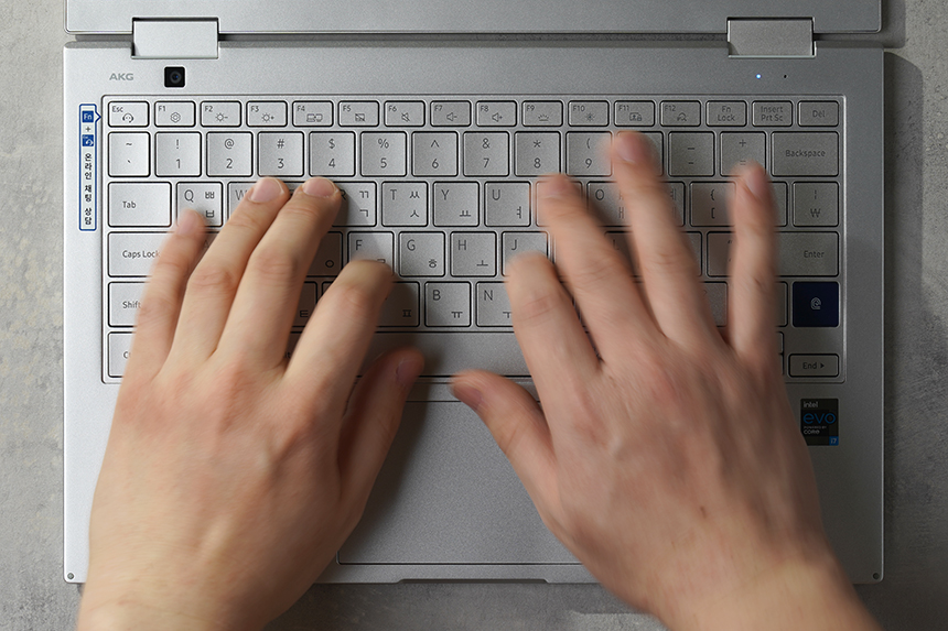 갤럭시북 플렉스2 5G는 슬림 노트북으로 설계되어서 키캡의 높이가 높은 편은 아닙니다. 그래서 키감이 다른 노트북과 비교해서 좋은 편이라고 이야기하기는 어려울 것 같습니다.