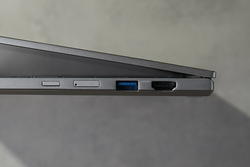 반대쪽 옆면에는 전원 버튼과 유심 슬롯 그리고 USB 3.0 타입A 포트와 HDMI 단자가 배치되어 있습니다. 참고로 2in1 노트북은 키보드를 360도 접어서 태블릿 형태로 활용하기 위해서 전원 버튼을 옆면에 배치하는 경우가 많습니다.