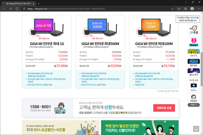 GiGA Wi 인터넷은 1G와 500M 그리고 100M로 구성되어 있습니다. 요금제는 약정한다면 크게 부담스러운 편은 아니라고 생각되었습니다. 그리고 자신이 거주 지역에 따라서 설치가 안 될 수도 있으니 미리 한 번 확인해 보시길 바랍니다.