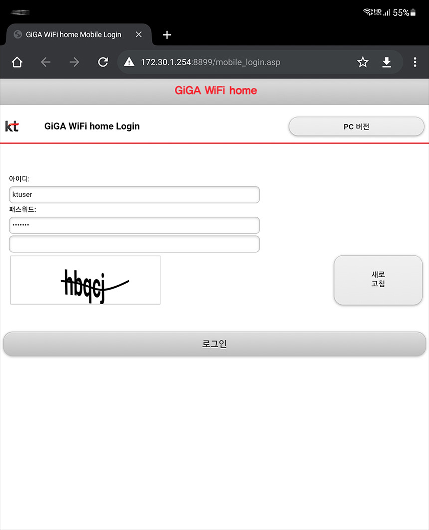 KT 기가 와이파이 홈 ax 공유기의 상세설정은 웹브라우저를 이용해서 http://homehub.kt.com 이라는 주소로 접속할 수 있습니다. 그리고 초기 사용자 ID는 ktuser이고 비밀번호는 homehub입니다.