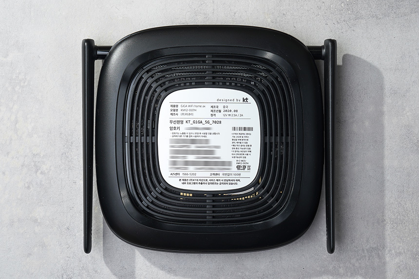 바닥을 살펴보면 기본으로 설정된 무선랜명과 암호키가 인쇄되어 있습니다. 그리고 네트워크 이름과 암호는 상세설정에 접속해서 변경할 수 있습니다. 그리고 365일 24시간 동작하는 공유기의 특성상 발열 해소를 위해서 통풍구들이 배치된 것을 확인할 수 있습니다.