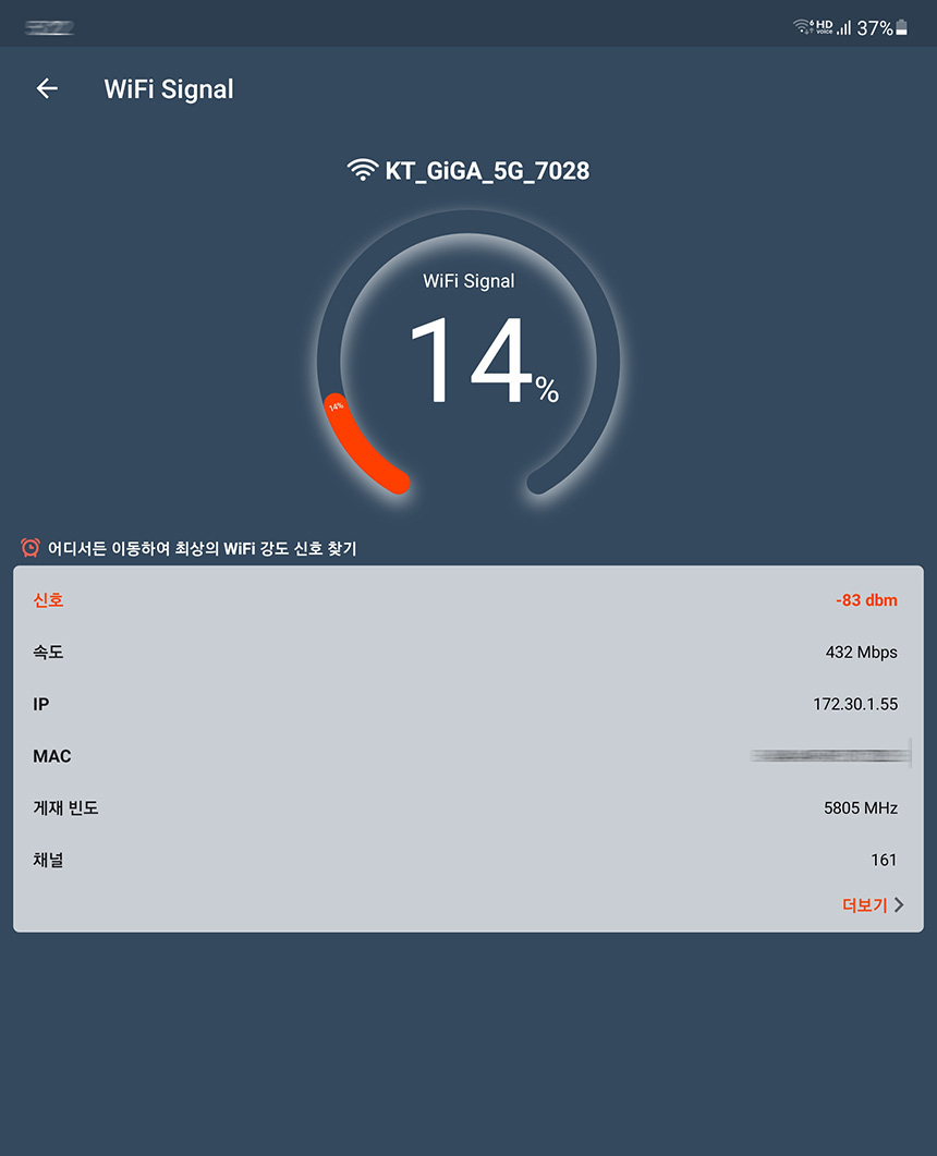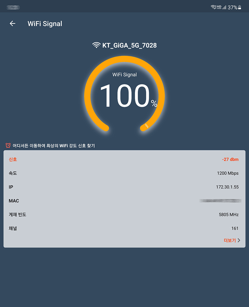 실제로 KT 기가 와이파이 홈 ax 공유기의 와이파이 신호가 제대로 전달되지 않던 장소에서 기가 와이파이 버디 ax 와이파이 증폭기를 추가한 것만으로 극적인 신호 세기의 향상이 있는 것을 확인할 수 있습니다.