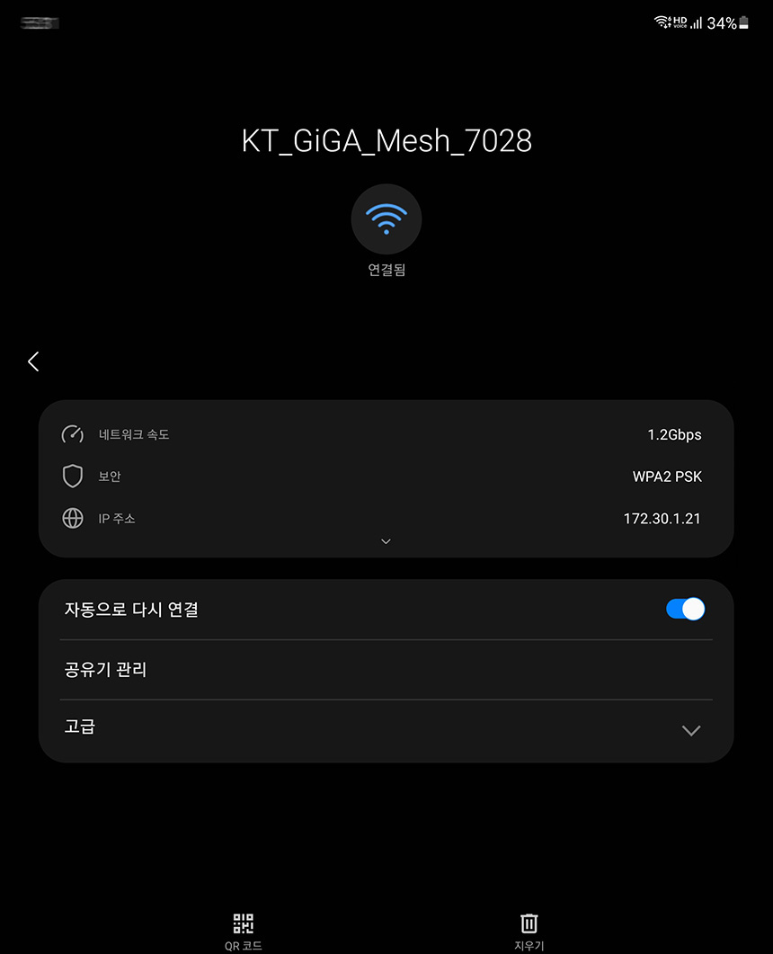 스마트폰을 이용해서 KT GiGA WiFi home ax 공유기에 접속해 보면 위쪽의 WiFi 표시 부분에 6이라는 문구가 추가되는 것을 확인할 수 있습니다. 그리고 네트워크 속도는 1.2Gbps로 연결됩니다.